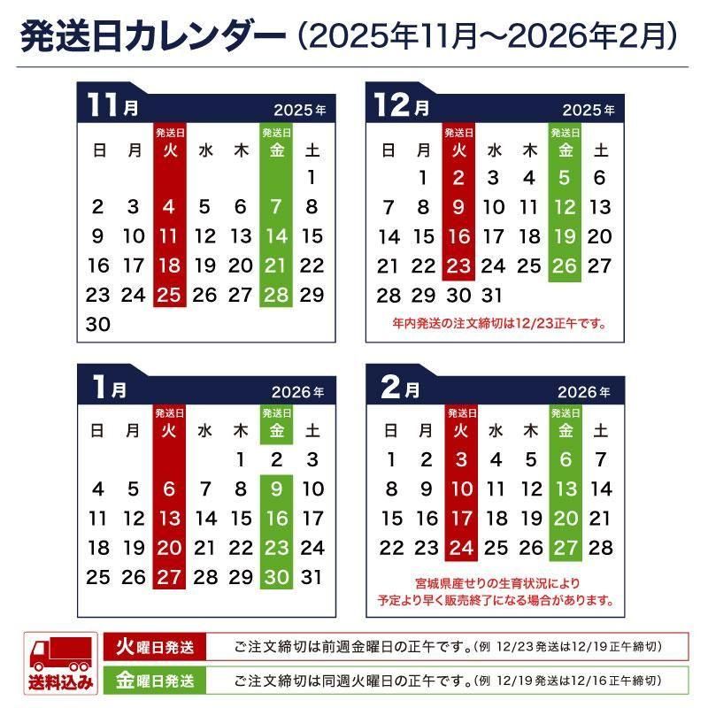発送日は毎週【火曜日】または【金曜日】です。 火曜日12:00までにご注文 → 同週の【金曜日】に発送いたします。 金曜日12:00までにご注文 → 翌週の【火曜日】に発送いたします。 ご注文のタイミングによってはお届けまで少々お時間がかかりますのでご注意ください。 ご希望の発送日がある場合は備考欄にご記入ください。 ご要望のない場合は直近の発送日でお届けいたします。